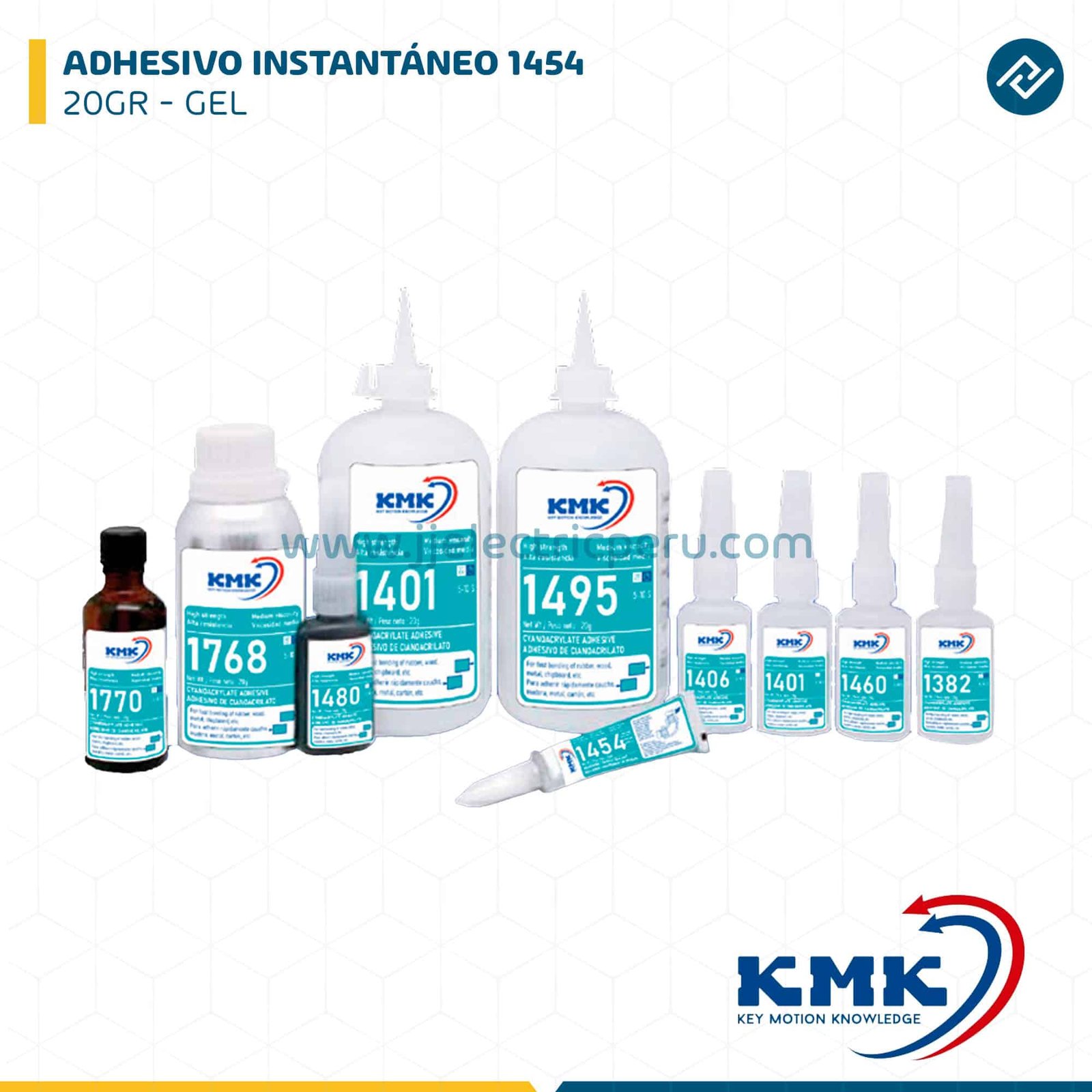 Adhesivo Instantáneo 1454 KMK en gel presentación de 20 gramos. Adhesivo de cianoacrilato de alta viscosidad para unión rápida, precisa y sin escurrimiento en aplicaciones industriales y de mantenimiento.