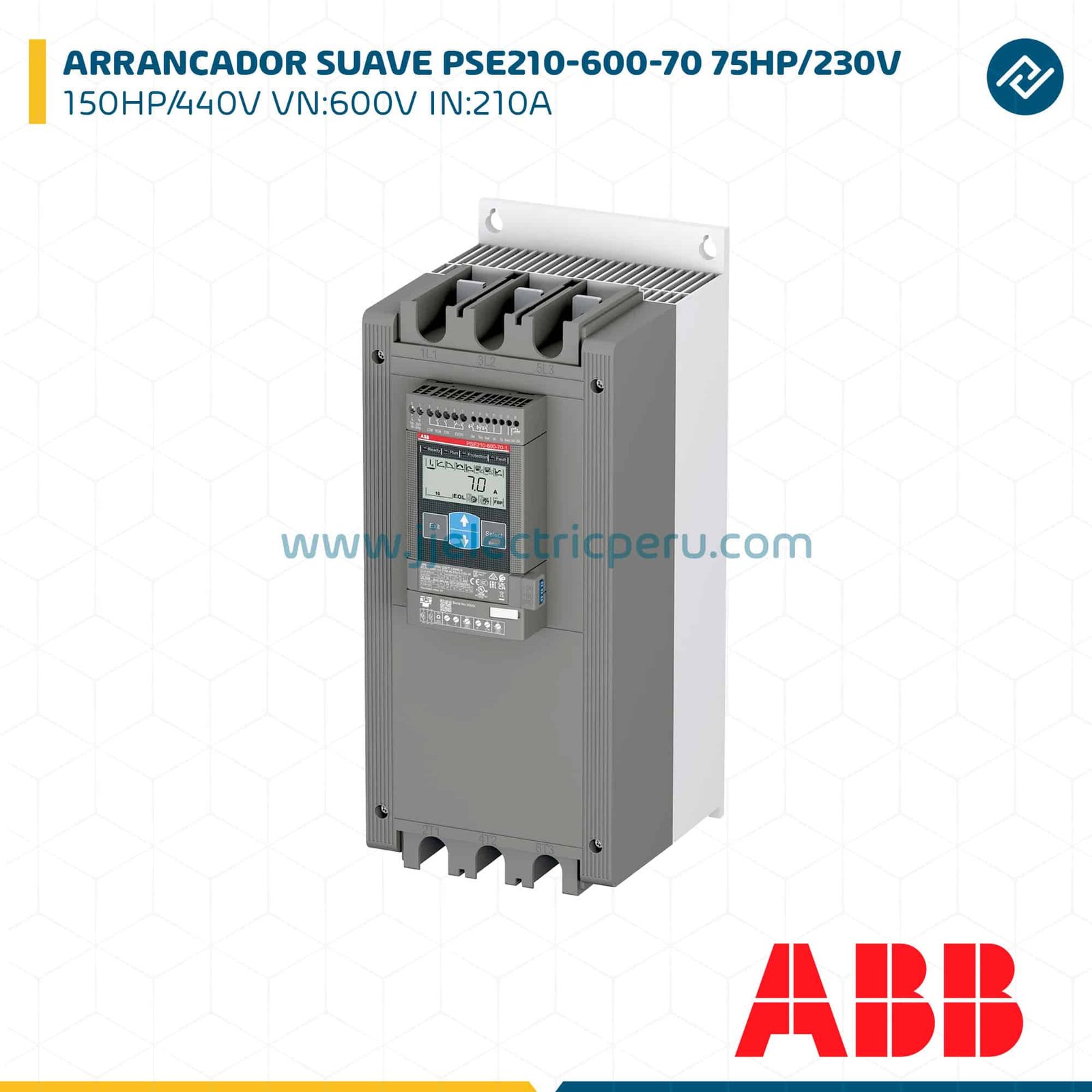 Arrancador suave ABB PSE210-600-70 de 210A y 600V, ideal para motores de 75HP a 230V y 150HP a 440V. Incorpora protección avanzada, comunicación Modbus y bypass interno, garantizando arranque progresivo, eficiencia y confiabilidad en aplicaciones industriales de alta potencia.