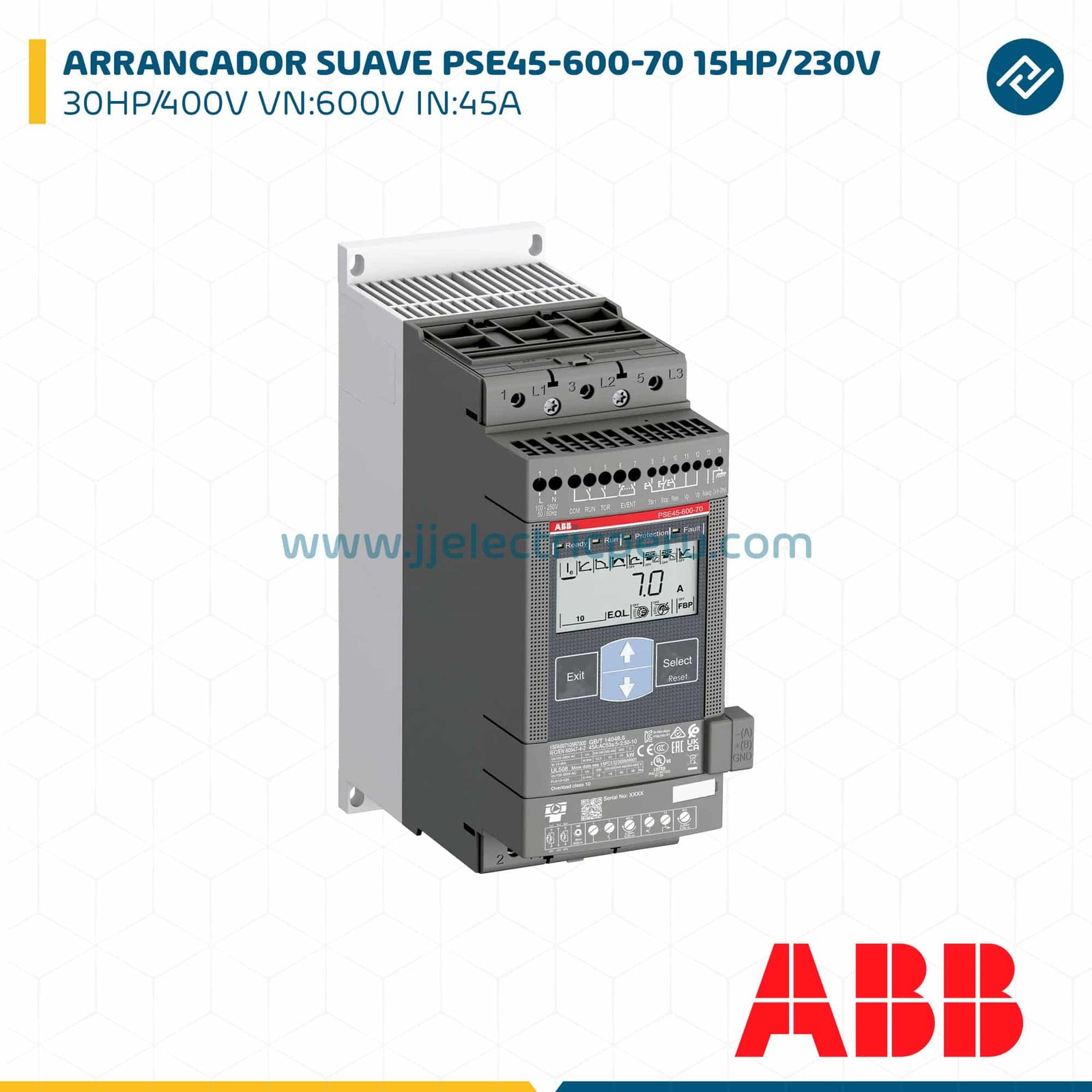 Arrancador suave ABB PSE45-600-70 de 45A y 600V, ideal para motores de 15HP a 230V y 30HP a 400V. Incluye Modbus RTU, protección térmica y bypass interno, ofreciendo arranque progresivo, eficiencia energética y máxima confiabilidad en aplicaciones industriales.