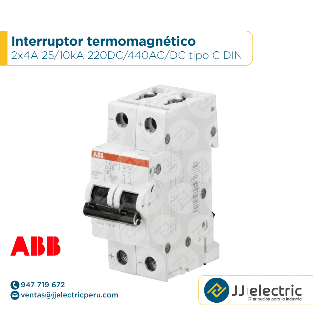 Interruptor termomagnético 2x4A 25kA 220VDC 10kA 440VAC/DC, diseñado con curva de disparo tipo C, montaje en DIN. Ofrecen protección contra sobrecarga y cortocircuito en una instalación eléctrica. Aplicación domiciliaria, terciaria e industrial.
