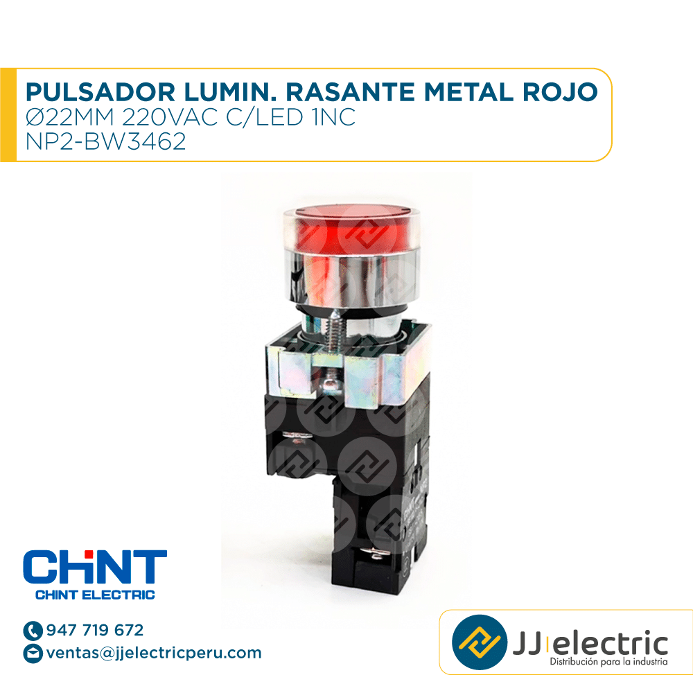 Pulsador Lumin. Rasante Metal Rojo Ø22Mm 220Vac C/Led 1Nc / NP2-BW3462 – CHINT