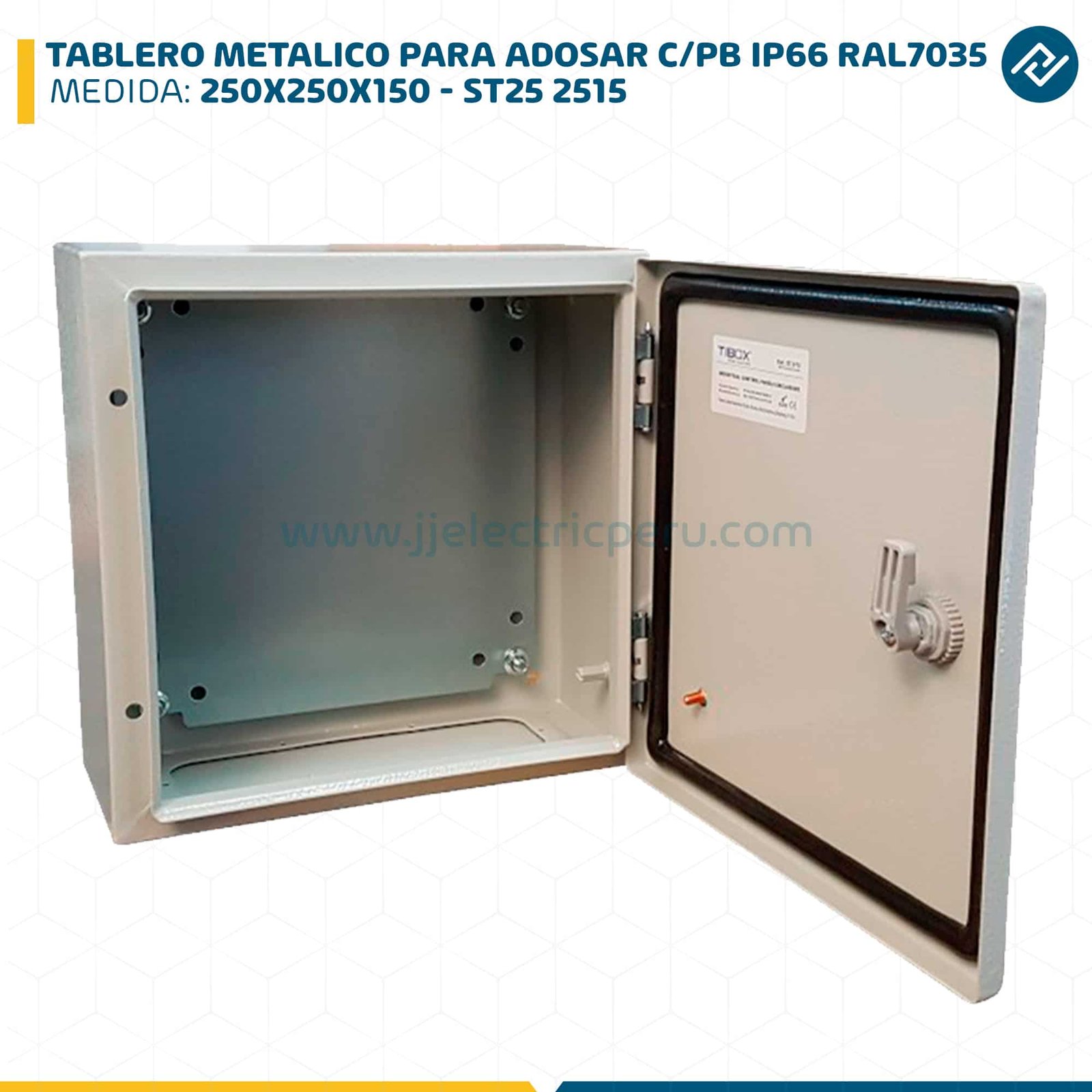 Tablero metálico para adosar de 250x250x150 mm, diseñado para la protección y organización de sistemas eléctricos en entornos industriales y comerciales. Fabricado en acero con recubrimiento en polvo color RAL7035, ofrece alta resistencia a la corrosión y durabilidad. Su grado de protección IP66 garantiza estanqueidad contra polvo y chorros de agua. Incluye placa de montaje (PB) para facilitar la instalación de equipos eléctricos.