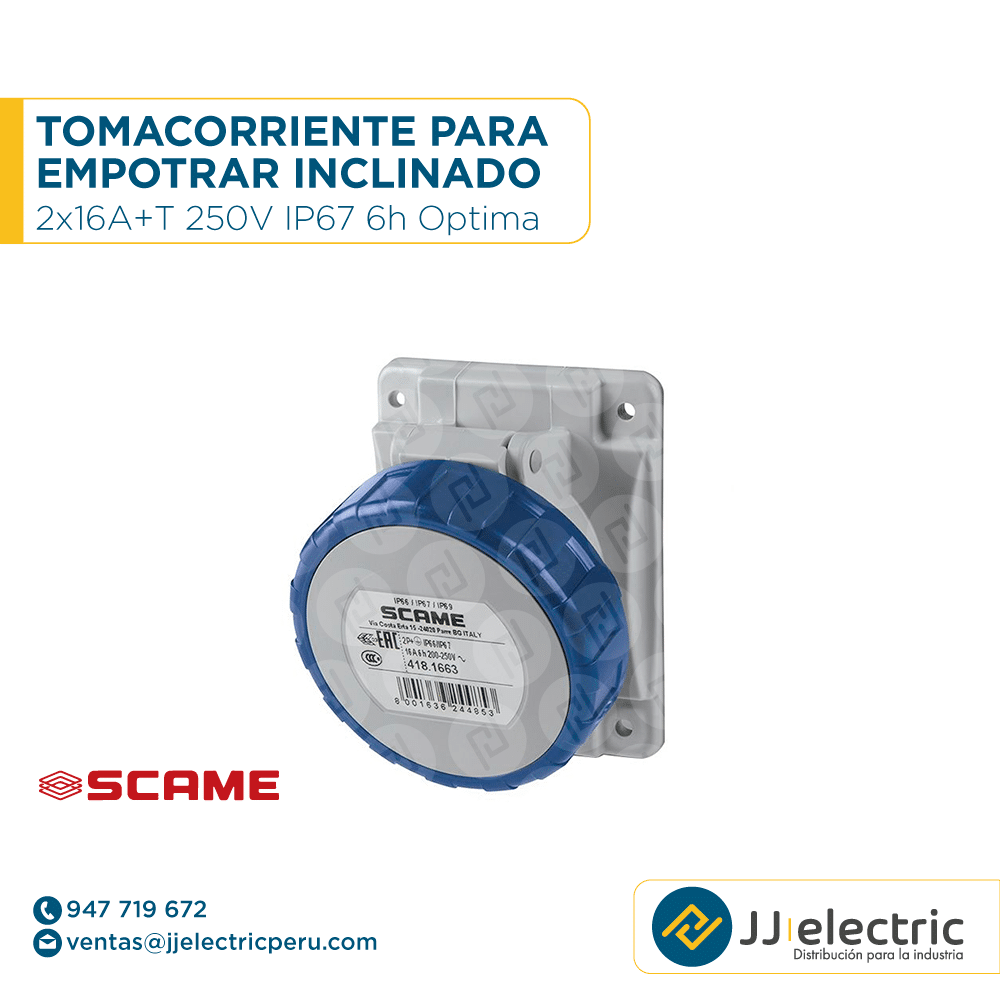 Tomacorriente p/empotrar inclinado 2x16A+T 250V IP67 6h Optima – SCAME
